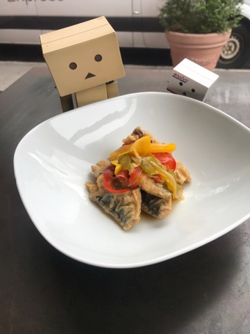 - Saba Nanban Zuke - Fried and Marinated Mackerel with Ginger, Carrot, Bell Pepper & Vinegar Soy Dashi (cold) {Pictured}