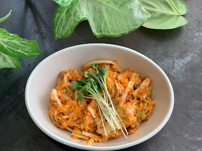 - Salmon and Masago Salad - Salmon Flake, Julienned Hakusai Cabbage and Radish Sprouts Mixed with Yuzu Mayo, Chili Sauce [pictured]