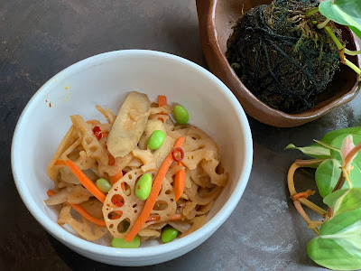 - Kimpira - Sesame Soy Seasoned and Sauteed Sliced Burdock Root, Lotus Root, and Julienned Carrot with Edamame (contains sesame oil and Chili pepper) // vegan // [Pictured]